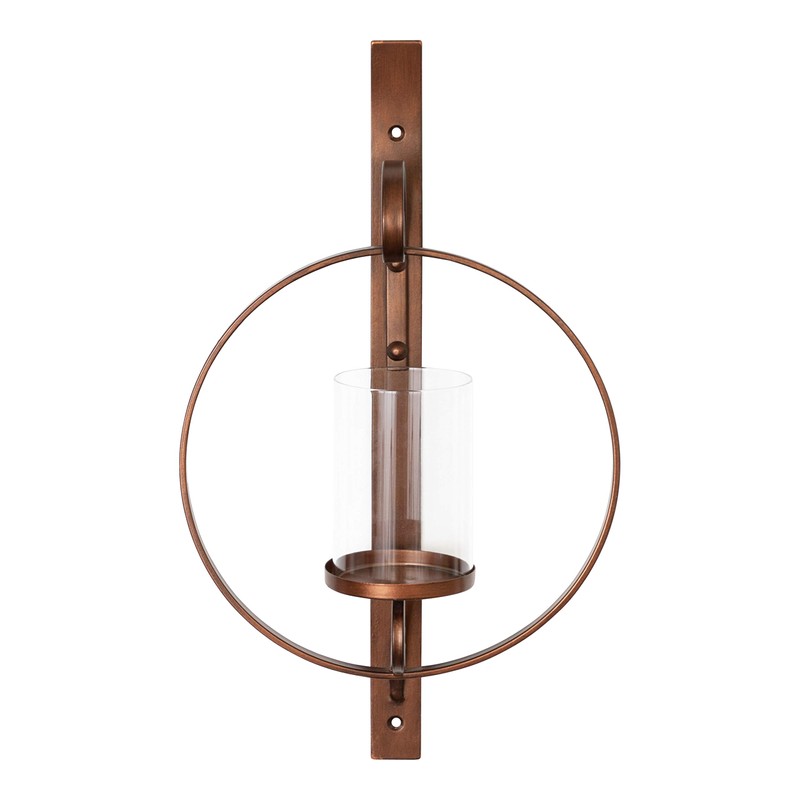 Create a stylish, sophisticated wall accent that lights up your home with the artisanal look of the Doria wall sconce. As a dimensional accent piece, this candle holder features an all-metal base and frame, finished in a delicate, yet transitional bronze finish. The Doria sconce has a tall, curved bracket with a circular frame surrounding a round metal tier for candles, succulents, and more. The rounded frame is metal-forged and welded to its curled, sturdy bracket, providing a dimensional, chic accent with construction to last for generations to come. The tier is also encased in glass to protect your decorative items from tipping or falling at the slightest provocation. The overall display dimensions of this beautiful wall sconce are 12.5 inches wide by 21.75 inches tall by 5.5 inches deep. These dimensions give you plenty of room for a medium-sized candle, used as a small decorative statement, or as a low light source for any living space. Hang the Doria wall sconce on its own or in multiples in a matter of seconds with convenient pre-drilled holes on the base of the frame.