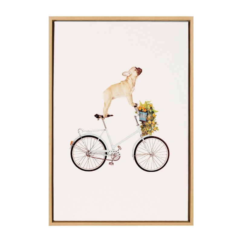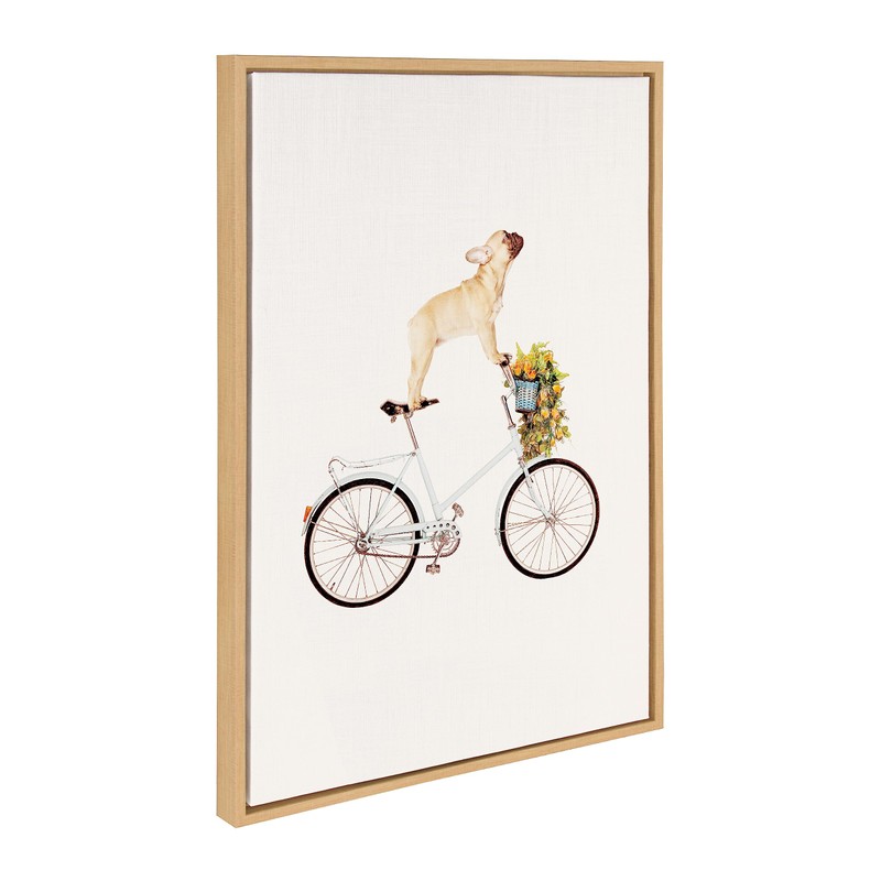 Kate and Laurel Sylvie Frenchie Bulldog on a Bicycle Framed Canvas Wall Art by Amy Peterson Art Studio; 23x33 Natural; Whimsical Animal Dog Art for Wall