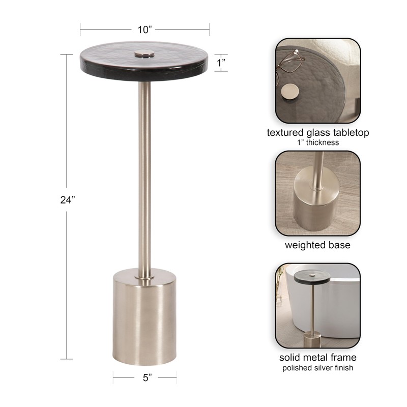 Kate and Laurel Xyler Modern Round Metal and Glass Drink Table, 10 x 10 x 24, Gray Glass and Silver, Decorative Plant Pedestal Table for Use as Indoor Plant Stand or Small Bathtub Table
