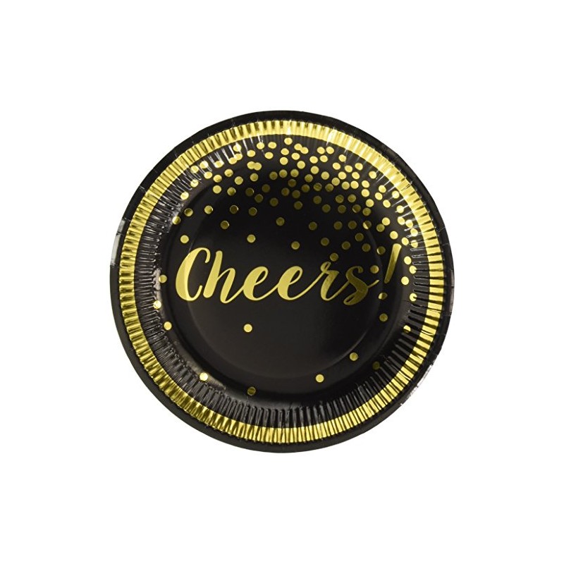 - Round black cardstock paper plates with gold foil details, border, confetti design, andcheers!message