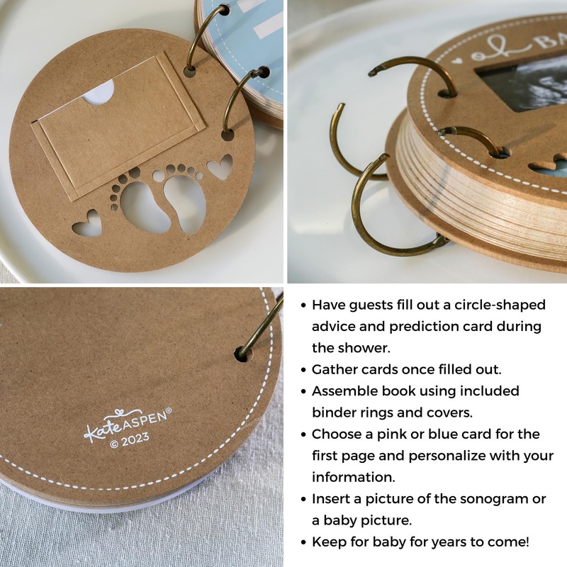 - Conveniently features 50 printed kraft advice and baby prediction cards in a circle shape. A front onesie shaped book cover that includes a window to place a 2.5 x 1.75 ultrasound or baby photo. A back onesie shaped book cover and 2 book rings to assemble after cards are filled out.
