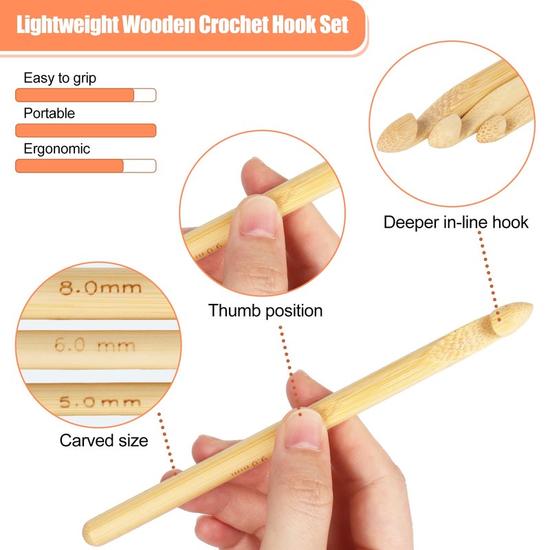 - Ergonomic Crochet Hook Set: The ergonomic crochet hook set for arthritic hands has a recessed space on the bamboo handle for thumb placement, gives you an extremely stable grip. The crochet hook is so lightweight that you don't even need to hold it tightly, keeps your hands from aching in longer crocheting.