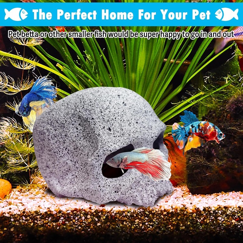 - CAVE HIDEOUT: There are holes on the skull, your lovely pet betta or other smaller fish would be super happy to go in and out the trunk cave to sleep, rest, hide, play, breed. It provides a house for your fish