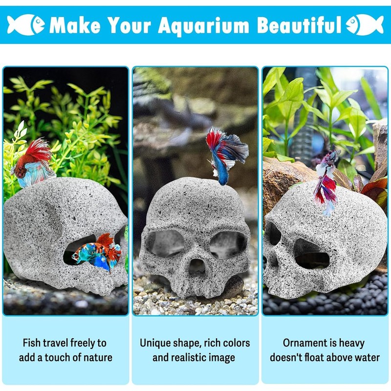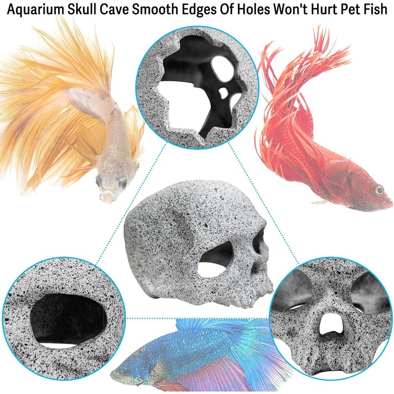 - CERAMIC MATERIAL: The aquarium skull cave is made of ceramic with the function of filtering water. Mimics natural stone texture to create a more natural visual effect, it is friendly for fish. Before putting the product into the aquarium, please rinse with water first