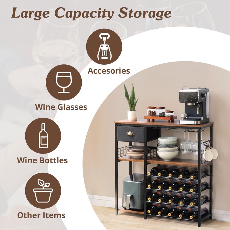 Freestanding Floor Wood Wine Bar Rack Cabinet, KATHY&BOB Morden 5-tier Wine Storage Shelf with Countertop, Coffee Bar with 20-bottle Stackable Wine Glass Holder for Home Bar Kitchen Dining