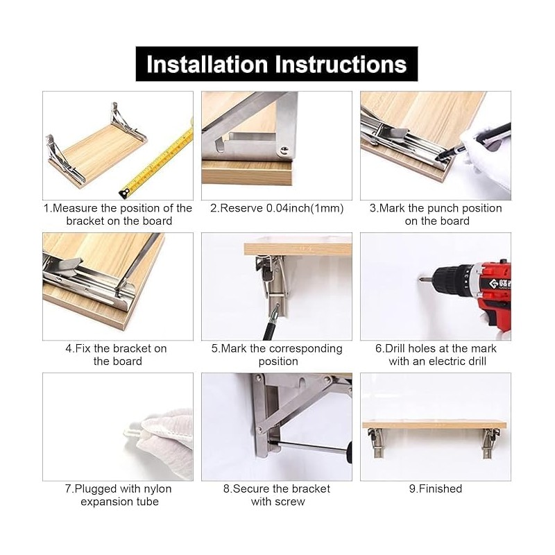 • EASY INSTALLATION The foldable bracket can be installed on any type of wall by simply drilling holes in the wall and inserting screws, then attaching the stainless steel bracket to the wall with short screws. When installing, you just need to make sure that the two folding brackets are parallel to each other and perpendicular to the wall; the screws need to be tightened to prevent loosening. (Note: the product does not contain wooden boards)