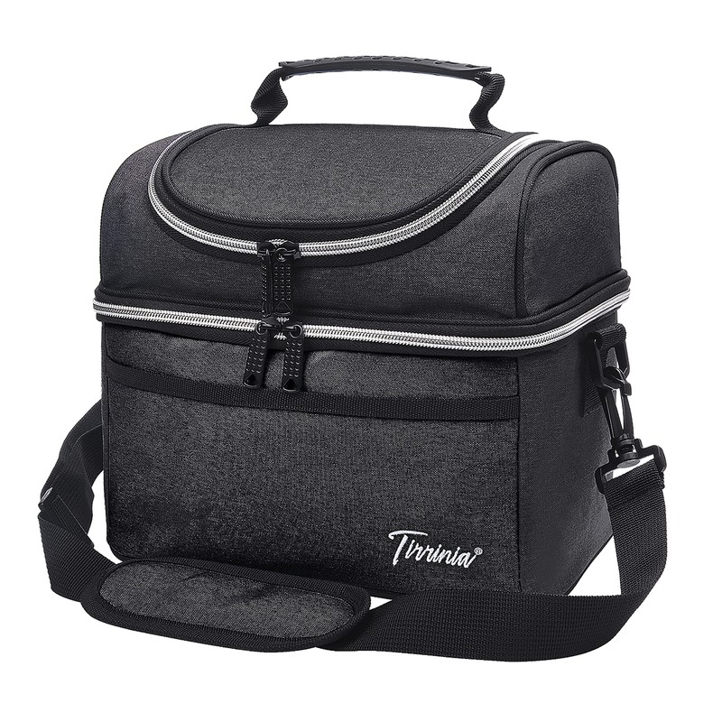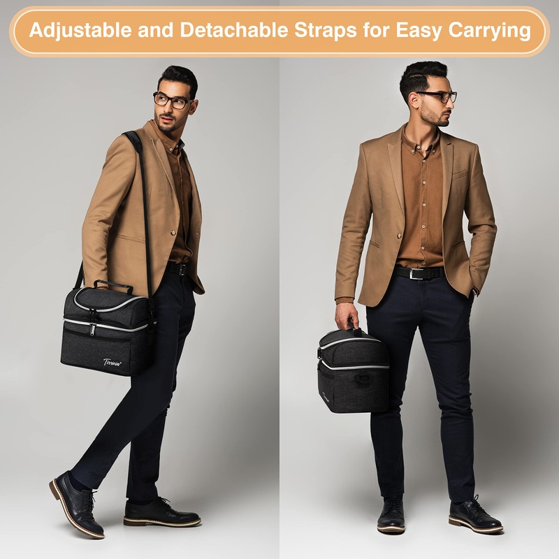 Kato Tirrinia Insulated Lunch Bag for Men and Women Leakproof Thermal Bento Cooler Bag for School and Work Double Compartment with Shoulder Strap and Front Pocket Oxford Cloth Black