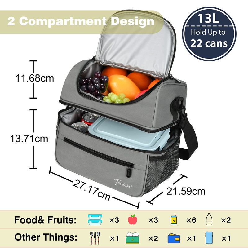 - 【Dual Compartment Design】The dual compartment design helps you to arrange your food conveniently. You can store meal prep bento containers or sandwiches in the bottom layer, and the top layer is more appropriate for holding fruits or drinks. The interior measurements of the bottom/upper compartment are: 27 x 20 x 14 cm / 27 x 20 x 13 cm (L x W x H).