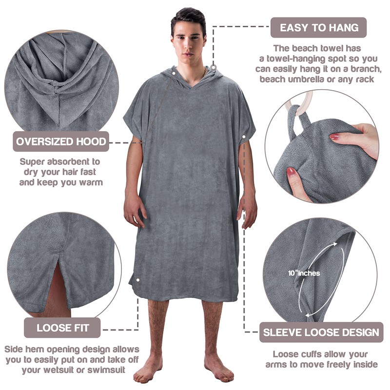 - Reusable bathrobe for the beach -- The soft microfibre material with hood is very absorbent and helps you dry your body and hair quickly. Feel free to go into the water with your friends and family!