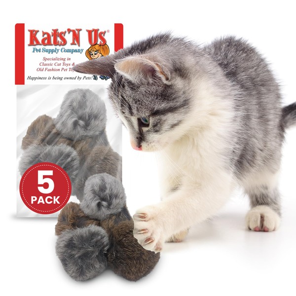 Kats'N Us 2 Inch Real Rabbit Fur Pom Pom Cat Toys – Pack of 5 Soft Gray Furry Balls, Natural Prey-Like Interactive Play, Hunting Instinct Exercise & Training Toys for Indoor Cats