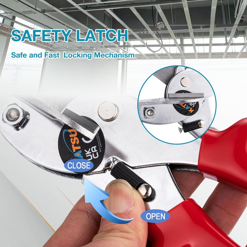 - Metal body fitted with a safety lock and comfortable PVC handle grips.
