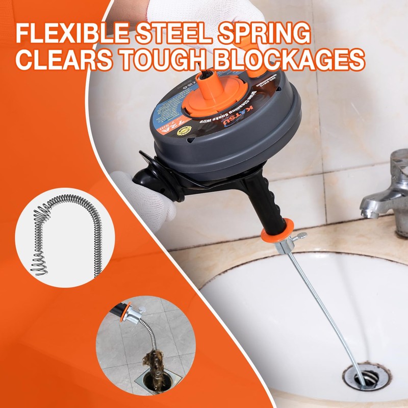 KATSU Tools Drum Auger Plumbing Snake Wire 6.35mm x 7.5m, Use Manually or Drill Powered, Drain Clog Unblocker Auger, for Kitchen Sink, Bathtub and Drainage Pipe 318712