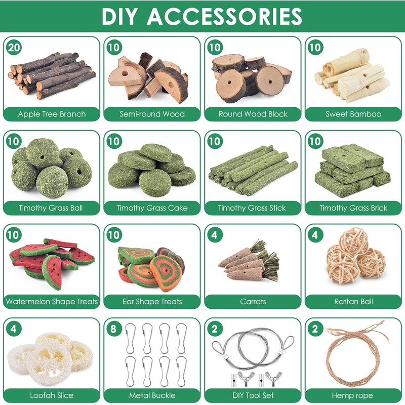 Packing List: The guniea pig toys set contains 20 Apple Wood Sticks, 10 Semi-round Wood Blocks, 10 Round Wood Blocks, 10 Timothy Grass Balls, 10 Timothy Grass Cake,10 Timothy Grass Stick, 10 Timothy Grass Brick, 10 Watermelon Shape Treats, 10 Ear Shape Treat, 4 Carrots, 10Sweet Bamboo, 2 Hemp rope, 4 Rattan Balls, 4 Loofah Slices, 4 Metal Active Hooks and 2 DIY Tool Sets. Enough gerbil toys accessories for funny diy into funny styles.