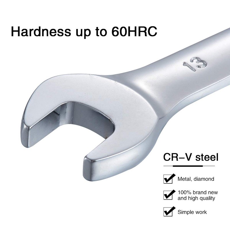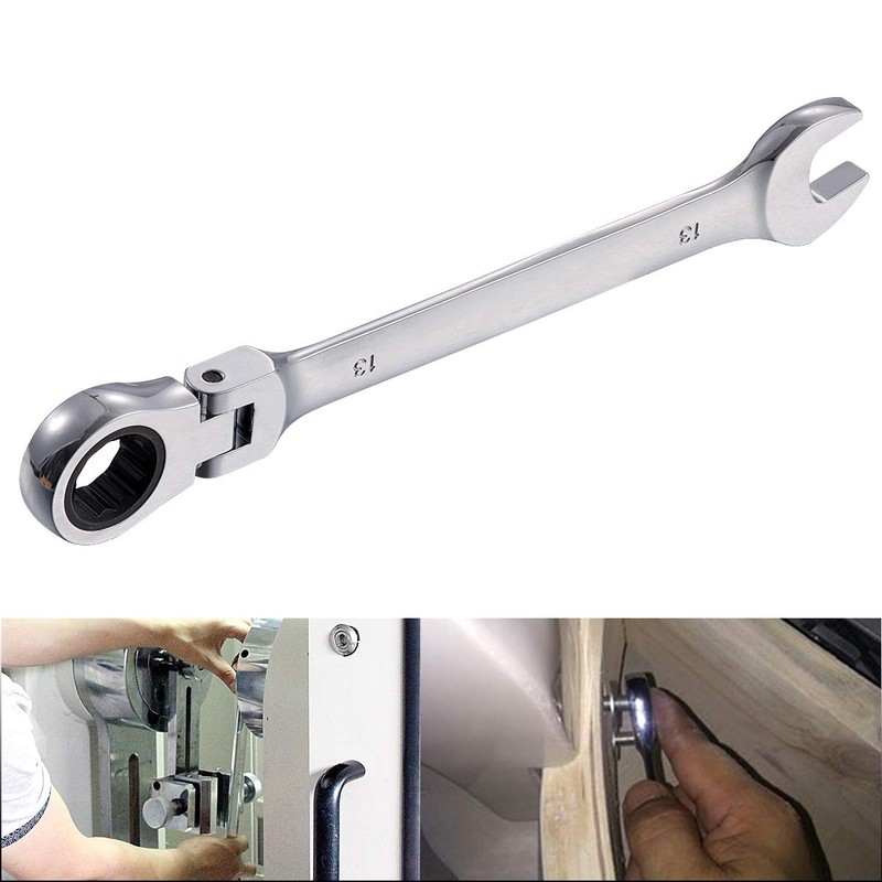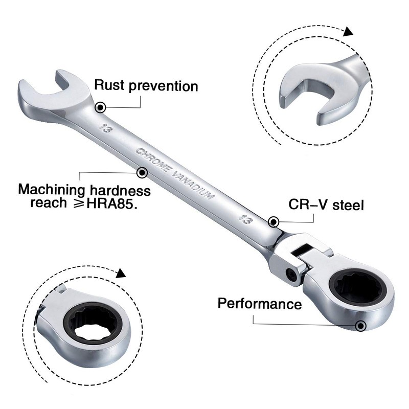 - ★【Flexible Ratcheting Wrench Set】13mm flexible pivoting head ratchet wrench is made of chrome vanadium with heat treated and mirror polished, durable in a long service.