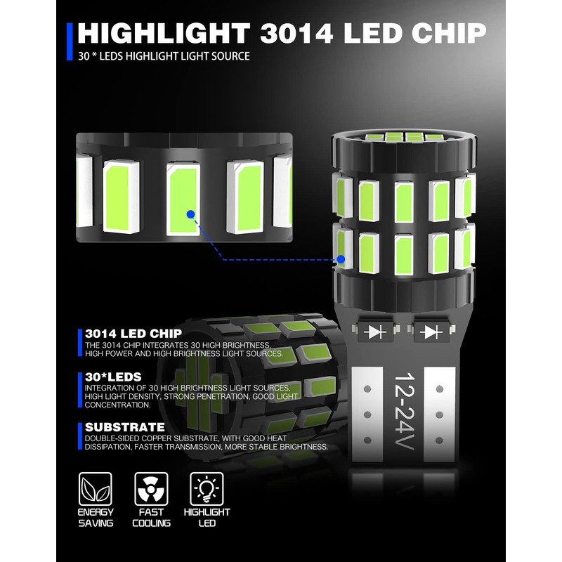 - ★ 【T10 194 W5W LED Bombilla】 (Paquete de 4) Alta potencia 30 piezas 3014 LED chipset por bombilla.Color: Ultra Ice Blue.Larga vida útil: 60,000 horas.Lumens: 450LM.Voltaje operativo: 12-24V.Potencia: 3W .Bajo consumo de energía para una vida útil más larga.