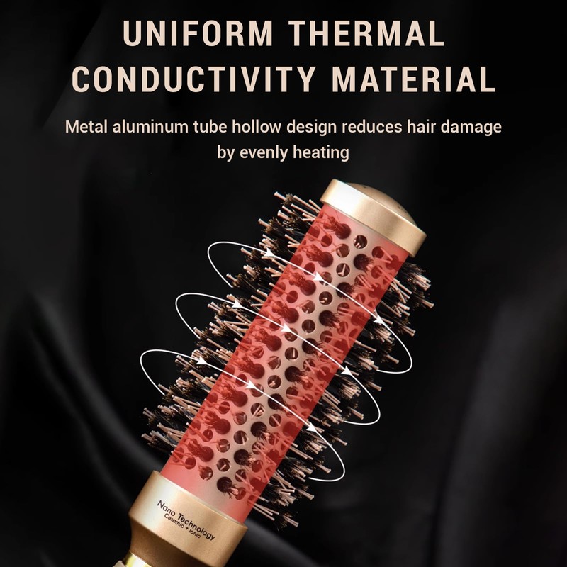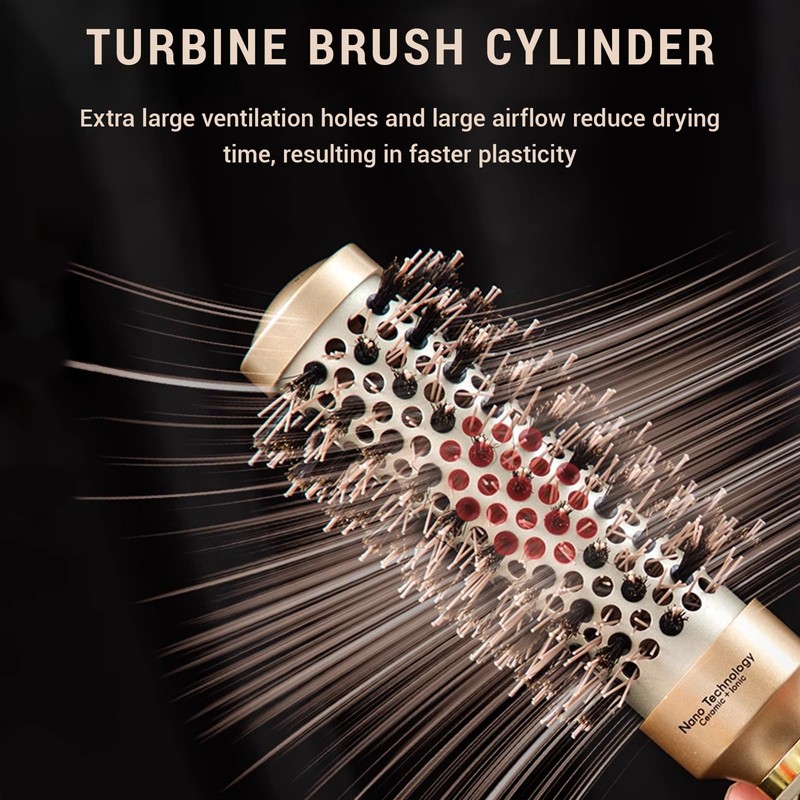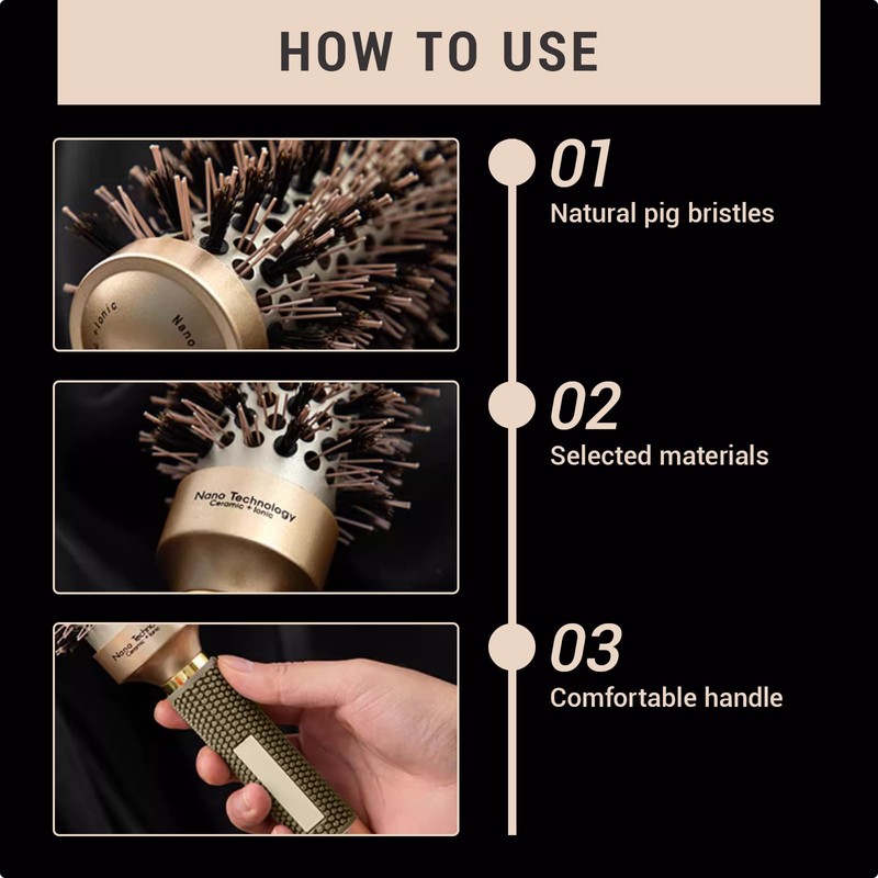 - Boar bristle round brush: the brush is made of high-quality boar bristles, which distribute the natural oils of the scalp evenly from the roots to the hair ends, making the hair shinier and silkier