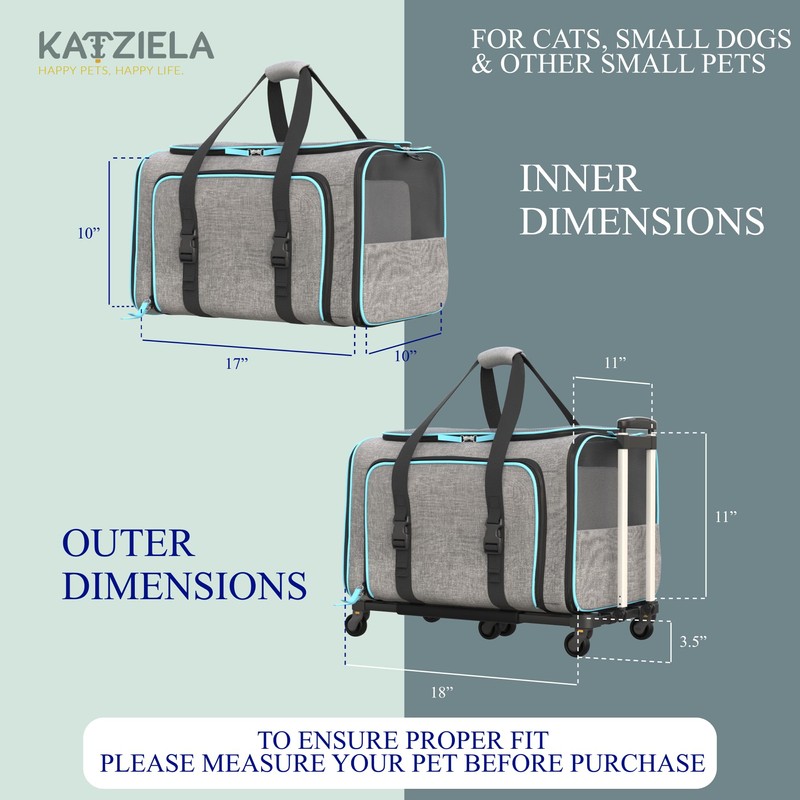 Katziela Rolling Rover Airline Compliant Expandable Premium Pet Carrier 6-Wheeled Baseboard Telescopic Handle Two-Sided Expandable Rolling Carrier Designed (Gray- Blue Piping)