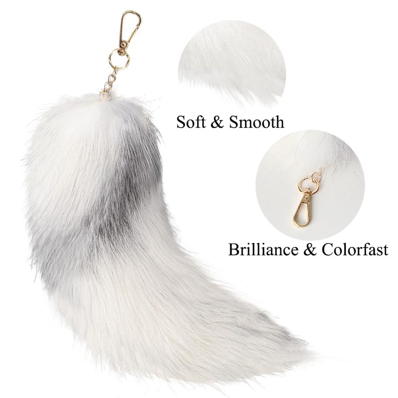 - Fox Tail Keychain: Our Fox Keychain comes from many different species of foxes in a variety of colors, which are Gen Fox Tail, Golden Island Fox Tail, Silver and Blue Fox Tail, Cross Fox Tail, and Pure White Fox Tail, Lotus Root Pink Fox Tail and Deep Purple Fox Tail. The tail is tipped with a gold carabiner, making the tail a stylishly, simple and attractive ornament pendant
