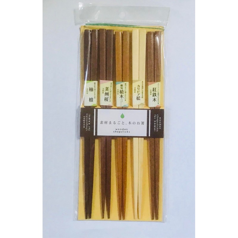 Kawai 027784 Chopsticks Set, 5 Pieces, Natural Wood, Five Patterns, 8.9 inches (22.5 cm)