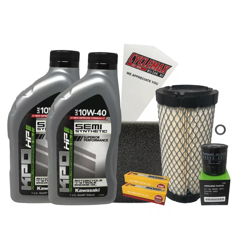 - CYCLEMAX TUNE UP KIT INCLUDES: Two Kawasaki K61021-300-01Q KPO Semi Synthetic 10W-40 Quarts of Oil, One Kawasaki 49065-2071 Oil Filter, One Kawasaki 11013-1290 Air Filter, One Kawasakio 11013-0037 Air Filter, Two Kawasaki BPR2ES NGK Spark Plugs, One 14mm Drain Plug Crush Washer and a Convenient Disposable Funnel.