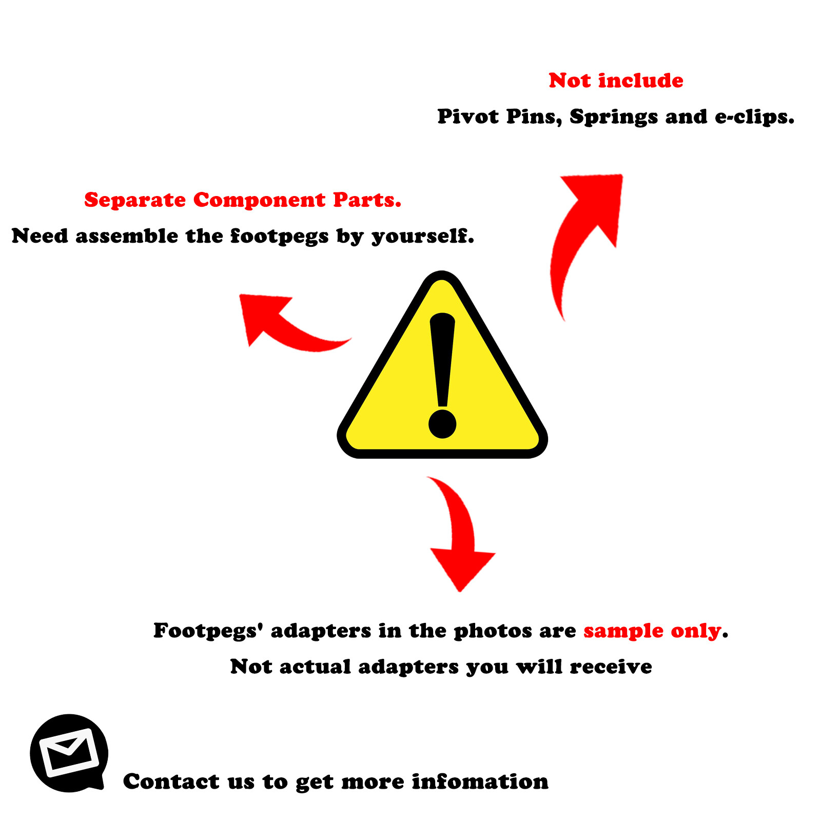 Footpegs' adapters in the photos are sample only. Not actual adapters you will receive. The adapters you received may differ from that. If you want the same adapters with the one shown in the photos. Please contact us first before purchase.