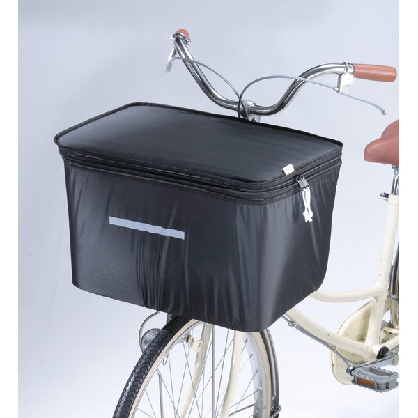 - The color of the main unit and zipper is all black, and the simple design is suitable for men. Comes with a reflective band for safe roads. 2 tier basket cover for extra storage. Waterproof and water-repellent treatment for peace of mind. Opens and closes easily. Elastic back Comes with a reflective band for safe night roads. 2-tier basket cover for ample storage. Waterproof and water-repellent treatment for peace of mind even on rainy days. Easy to open and close with both sides. Front pocket Elastic rubber on the back