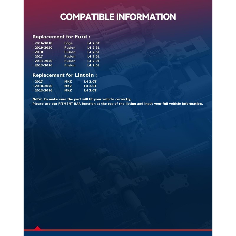 - Vehicle Fitment: Compatible with Ford Fusion 2.5L 2013-2020, Fusion 2.0T 2013-2020, Edge 2.0T 2016-2018; Compatible with Lincoln MKZ 2.0T 2013-2020