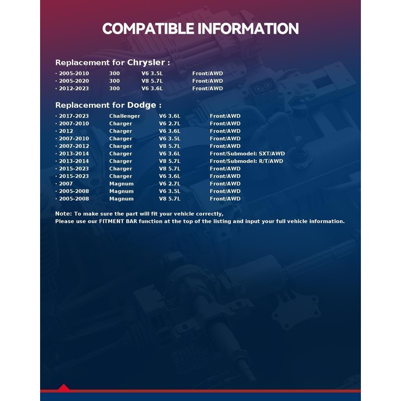 - 【Vehicle Compatible】:513225 Wheel Bearing and Hub Assembly fits for 2007-2023 Charger, 2005-2023 300, 2017-2023 Challenger, 2005-2008 Magnum