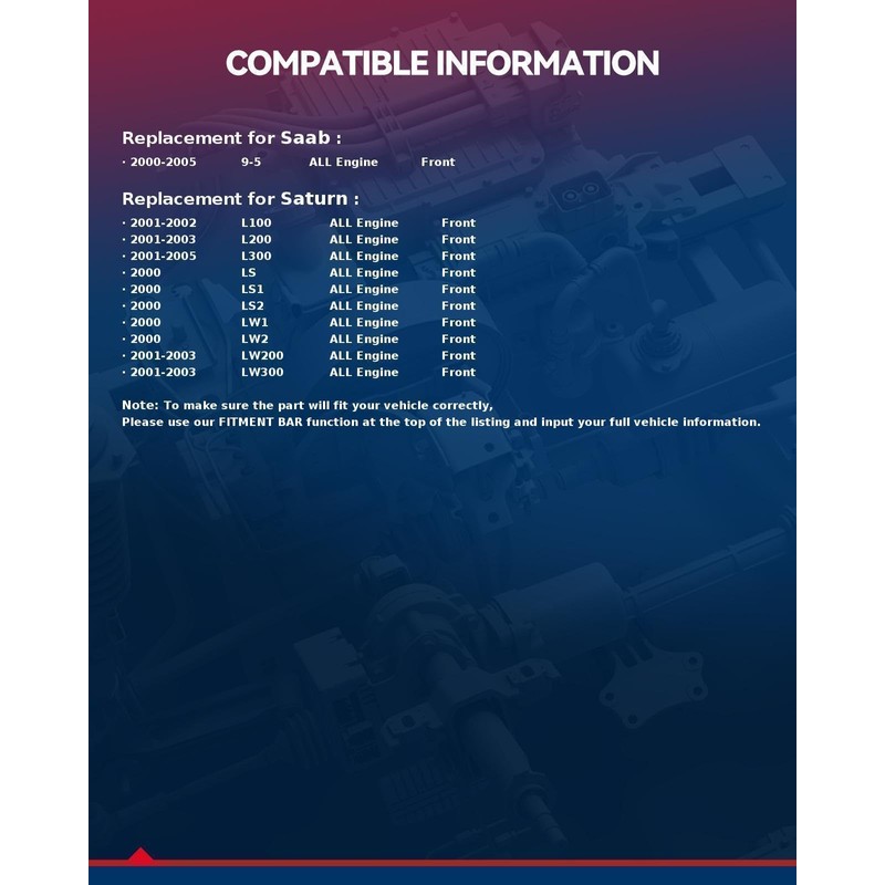 • Precise Fitment Vehicle Compatibility: KAX Brake pads Designed and manufactured to OE specifications, a perfect fit for Front OEM and aftermarket drilled and slotted brake pads. Fit for Saturn L200 2001-2003, Saab 9-5 2000-2005, Saturn L300 2001-2005, Saturn LS1 2000, Saturn L100 2001-2002, Saturn LW200 2001-2003, Please check the compatibility of this brake pad with your vehicle before purchase.