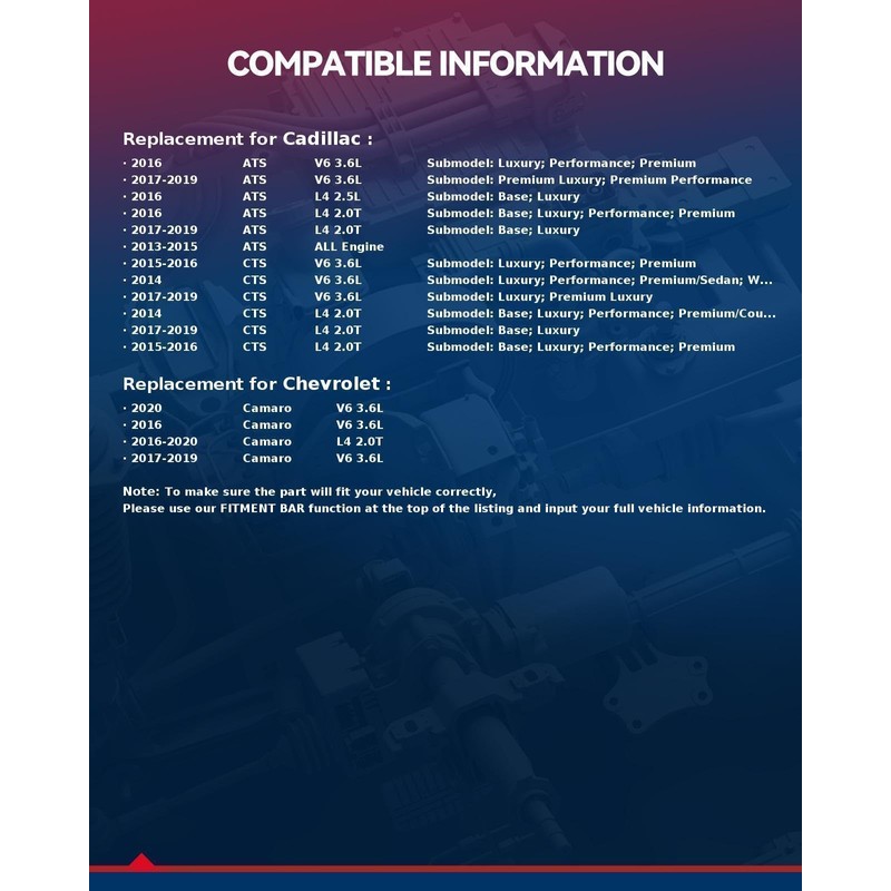 - Vehicle Fitment: Compatible with Chevrolet Camaro 3.6L 2016-2020, Camaro 2.0T 2016-2020; Compatible with Cadillac ATS 2013-2015, ATS 2.0T 2016-2019, ATS 3.6L 2016-2019, ATS 2.5L 2016, CTS 2.0T 2014-2019, CTS 3.6L 2014-2019