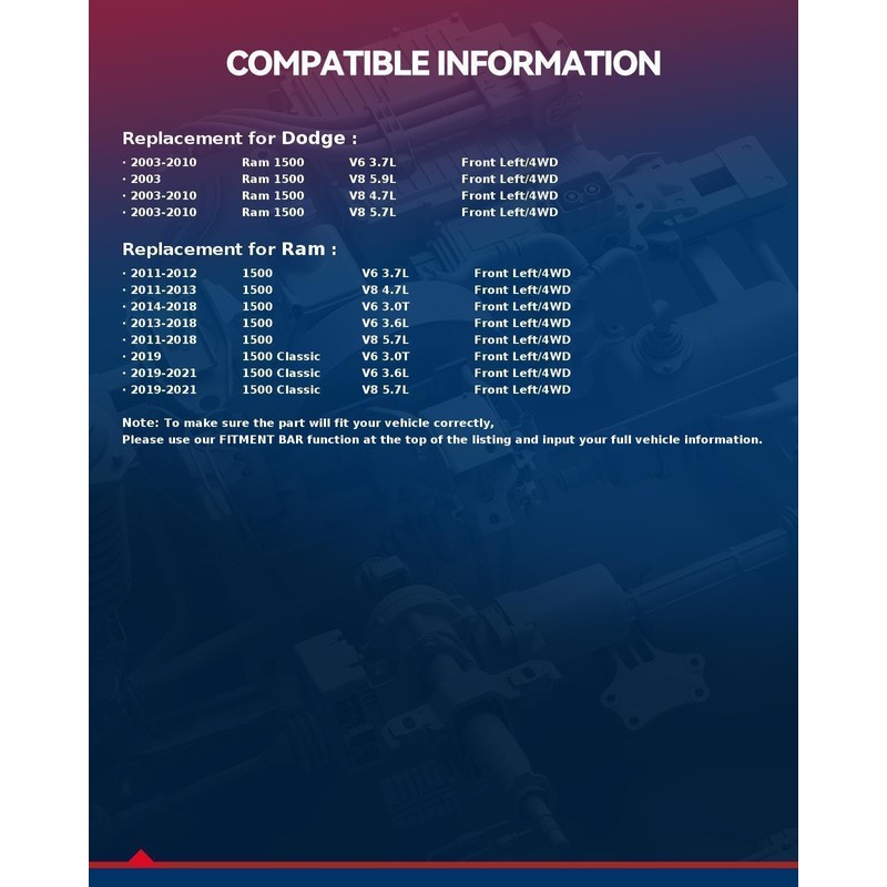 - 【Vehicle Adaptation】:This steering knuckle compatible with 1500 2011-2018, Ram 1500 2003-2010, 1500 Classic 2019-2021