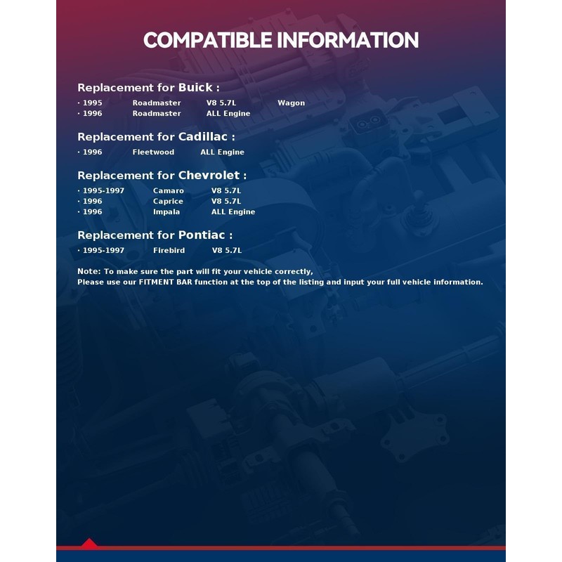 - [Vehicle Compatibility] : This CNC machined starter compatible with 1995-1997 Chevy Camaro 5.7L V8, 1995-1997 Pontiac Firebird 5.7L V8, 1996 Chevy Caprice 5.7L V8, 1996 Chevy Impala, 1996 Buick Roadmaster, 1996 Fleetwood, 1995 Buick Roadmaster 5.7L V8.Please confirm whether your model matches this product model.