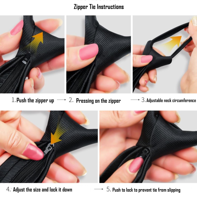- ✔Ties Zipper For Men How to use: Adjustable by String Cords Buckle Adjuster closure Pull down on the zipper to loosen the neck loop. Pull on the loop immediatly gets longer. This loop will stays in same location no matter the zipper is unzipping or not. Then to tighten, pull down on the tie. Super easy and save time for you.