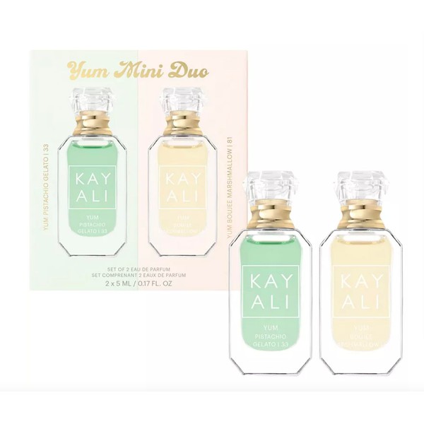 • Indulge in this limited-edition KAYALI Mini Yum Duo set in their new dabber: deluxe, 5 mL miniature sizes. Perfect to gift or collect, this coveted set features the delicious Yum Pistachio Gelato | 33 Eau de Parfum Intense and the irresistible Yum Boujee Marshmallow | 81 Eau de Parfum Intense.