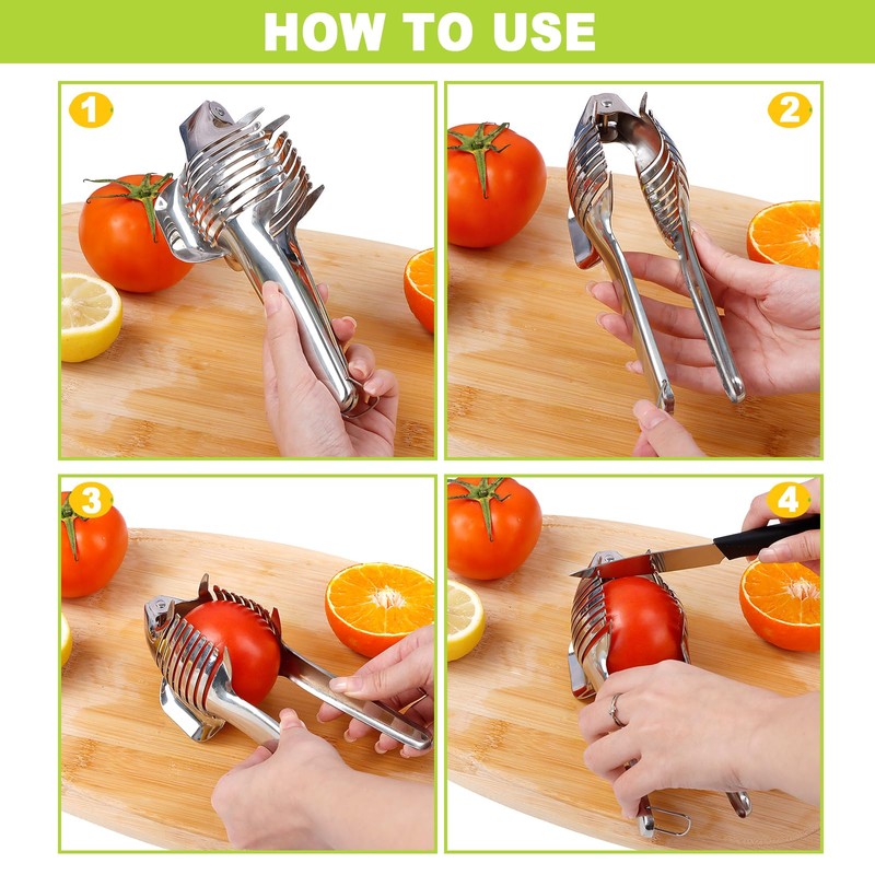 - [ Slice Safely and Evenly] The tomato slicer holder allows you to slice tomatoes, onions, lemons or other food into perfectly even slices every time without having to worry about cutting your fingers. Say goodbye to tedious and time-consuming slicing and hello to hassle-free vegetable prep!