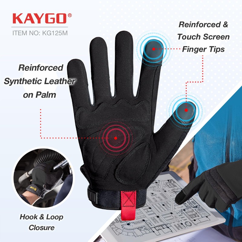 KAYGO Mechanical Work Gloves for Men, Abrasion-Resistant Robust Mechanic Gloves with Touchscreen Faux Leather Palm Protection and Good Grip, for DIY Construction Site Gardening, KG125M