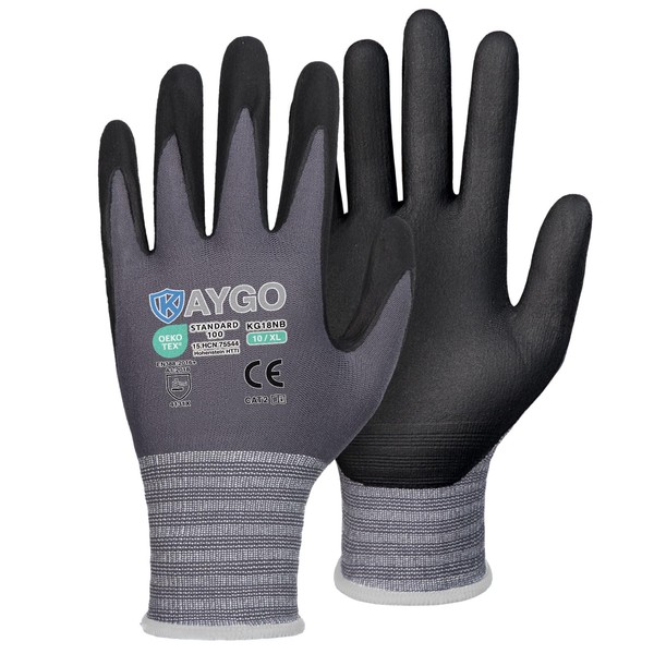 KAYGO 15 Gauge Seamless Nylon Knit Glove with Nitrile Coated Micro-Foam Grip KG18NBExcellent Safety Work Gloves for General Duty!Nitrile Coating:Excellent dry grip, thicker coating offers superior resistance to snag, cut, puncture and abrasion. When enhanced by a foam coating, it offers very good grip in chemicals including oils, petrochemicals, fuels and most acids.Micro-Foam Grip:Offers absolutely breathability and excellent grip performance in wet/oil and dirty conditions.OKEO-TEX CERTIFICATED:friendly to your skin!CE EN388:4131APPLICATIONS: General assembly Micro-engineering Automotive components Painting Horticulture DIYYard workCARE INSTRUCTIONSRecommend washing gloves in slightly warm water not exceeding 40°C. A mild non-ionic detergent should be used. A 5-10 minute cycle time should be employed. Tumble dry on low-maximum temperature 140°F (60°C).KAYGO KG18NB Safety Work Glove, YOUR HAND'S PARTNER!