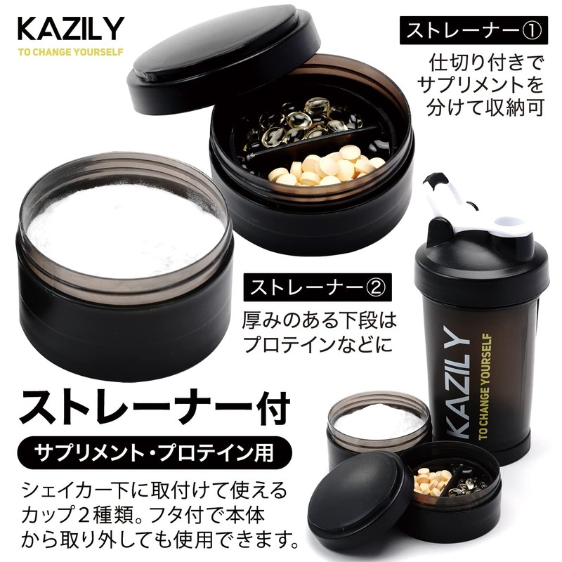 - Includes Supplement and Protein Storage Cup: Comes with 2 types of strainers that can be attached under the shaker. Low-profile cups with dividers for multiple supplements and more Thick cups for protein powder and more. Both types come with a lid, so you can remove it from the shaker. Recommended for beginners to train muscles