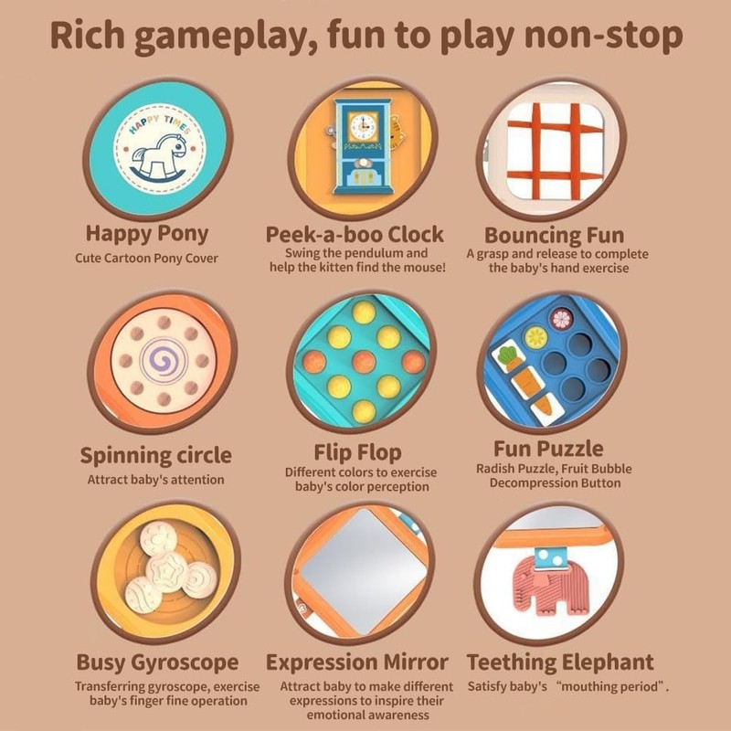 - 8-in-1 Montessori toy for babies: Our Montessori motor skills cube toys for babies combine eight interactive toys specially developed for children and can be used in a variety of ways to develop the motor and cognitive skills of toddlers. These include a Carrot puzzle, rotating gears, an elastic woven band, a fun mirror, a hidden watch game, a spinning wheel and many other activities