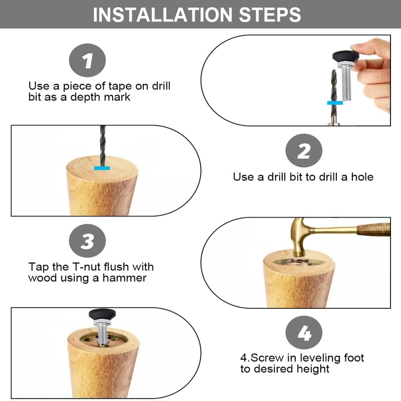 - Height Adjustable - The furniture leveling feet can adjust the height and angle, thus maintaining the balance of furniture and solving the problem of uneven floors. Besides, they can keep your furniture away from wet floors, protect the bottom of the furniture and extend the life of the furniture.