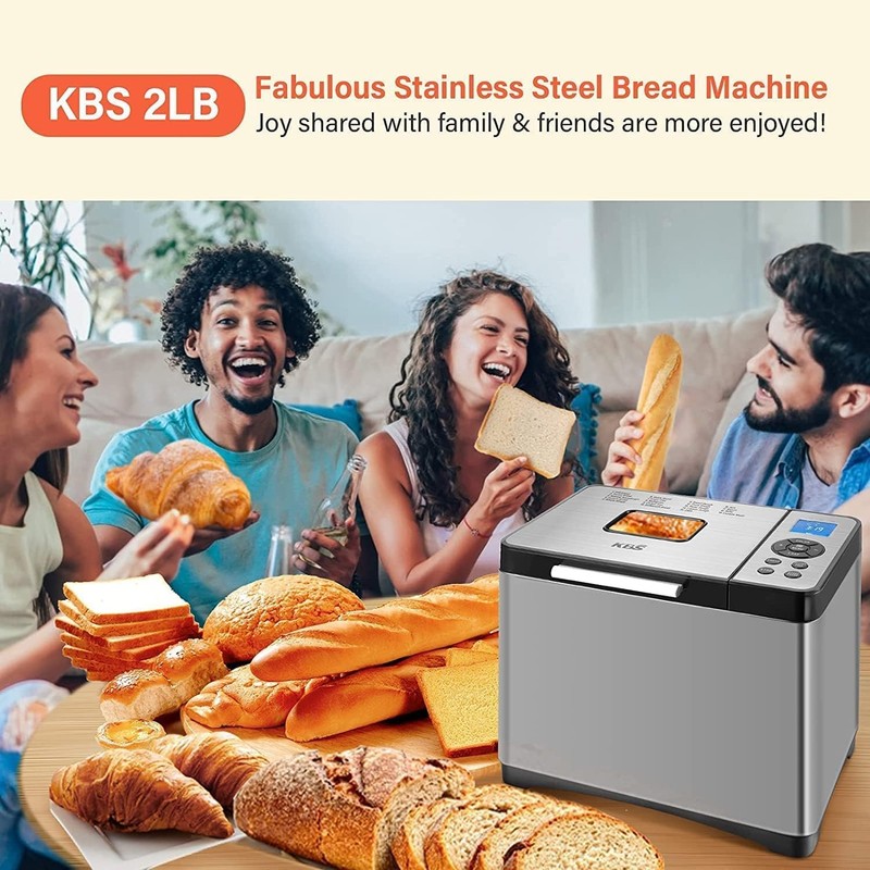 - STAINLESS STEEL COMPACT HORIZONTAL DESIGN AND INTUITIVE DIGITAL PANEL: Stainless steel bread making machine is durable, it has an elegant look and blends perfectly with kitchen. Horizontal bread maker machine with intuitive digital panel, it has an extra large see through window to observe the bread process. Magic kneading paddle fine study 2 mixes, 3 ferments to stabilize the dough. KBS breadmaker upgraded buttons are sensitive and fast. Separate kneading and gluten free buttons for easier use