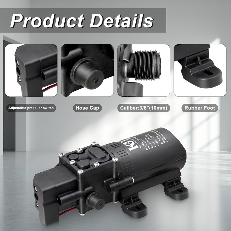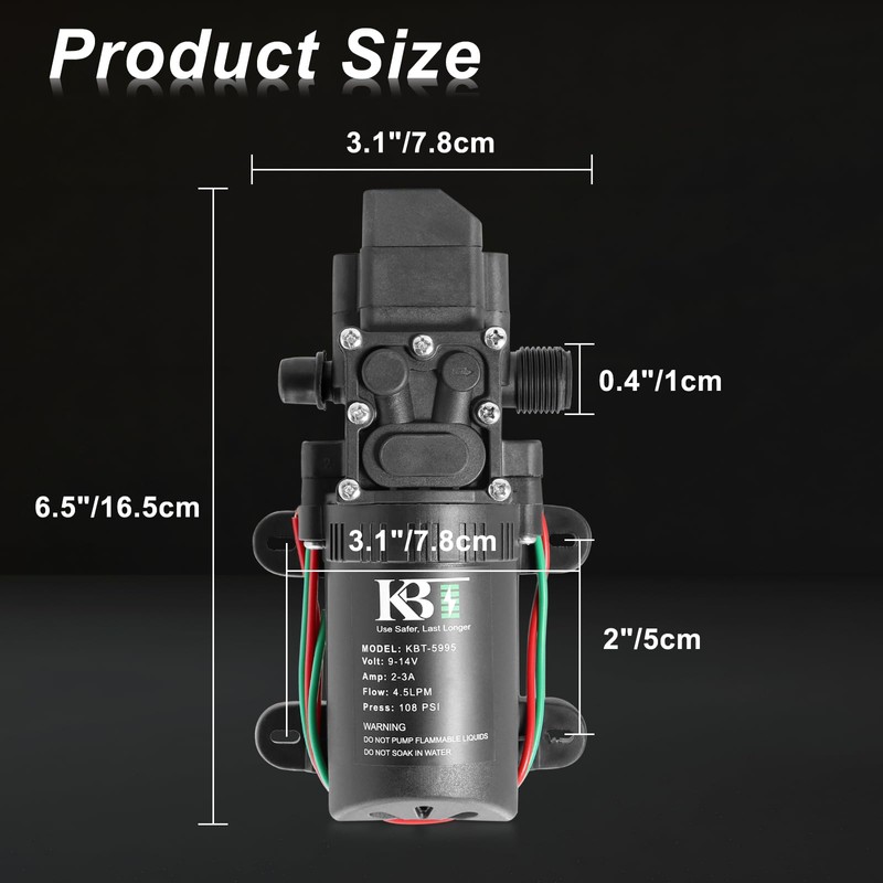 - 【Reliable Performance】: The KBT 12V DC water pump can provide a water flow rate of 1.05GPM, with a pressure switch set to 108PSI and a head of up to 59 feet. Low noise, low power consumption, and high performance