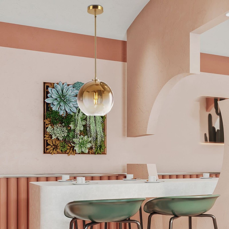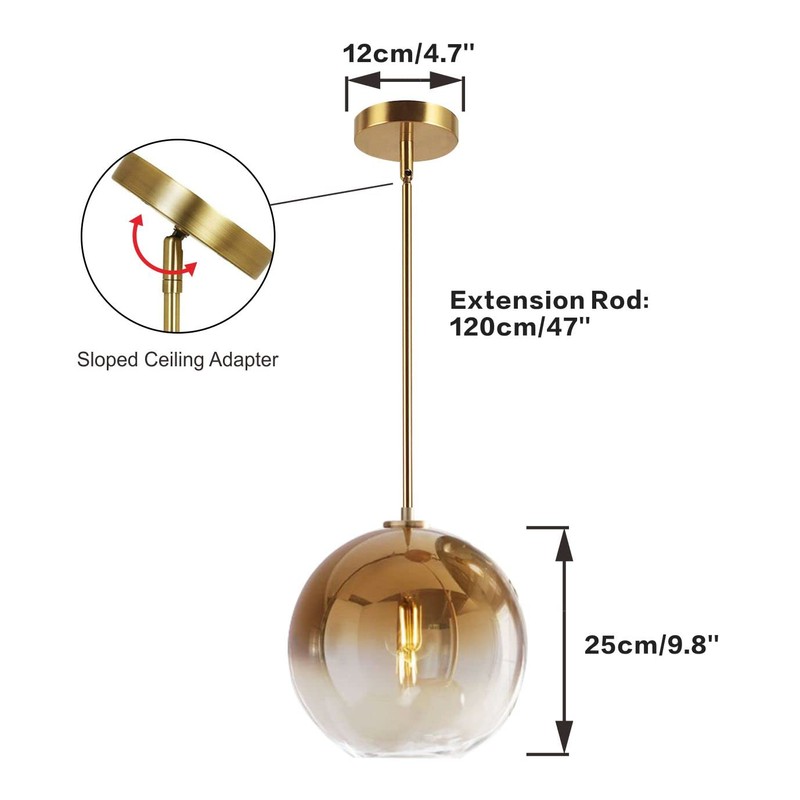 - ✽Adjustable Height✽The gold globe pendant light comes with 4*11.8” extension rods, allowing a variety of hanging heights, the radiates at different levels and gives it an elevated look. Globe diameter: 9.8” (25cm), Canopy size: 4.7” (12cm), Voltage: 110-220V for worldwide.