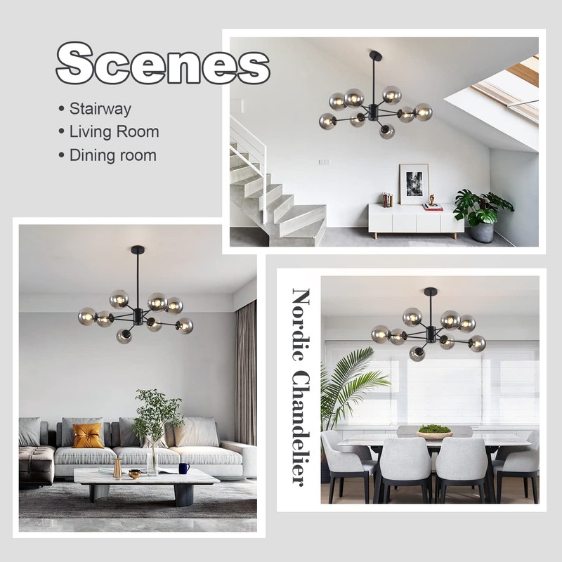 - Mid Century Modern Sputnik Chandelier: The globe chandelier light arm extend out from the center post, smoke grey glass globe lampshade diffuse the light to create a welcoming glow. Matte black together with smoke grey, the whole light fixture is smooth lines, good texture. When it turn on, the lighting will reflect through the glass, adding a romantic, fancy and shining atmosphere to your room