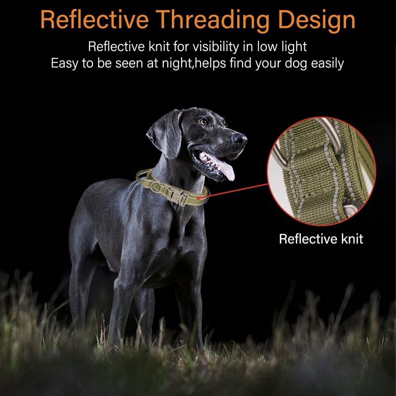 - Reflective Design – Elevate safety with our reflective tactical dog collar and leash set, designed for enhanced visibility during nighttime outings. Featuring reflective stitching along the durable nylon webbing, this dog collars for medium dogs ensures your dog is easily seen in low-light conditions.