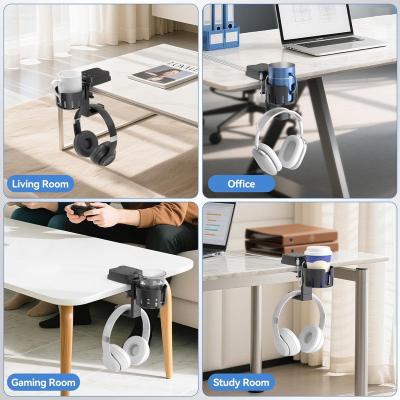 • Swivel Hook & Detachable Cup Holder - The headphone hook with soft rubber pads prevents headphones from accidentally falling out. It also rotates 360°and can be hidden under the desk when not in use. The cup holder design prevents accidental bumping and spilling of drinks while working or studying.