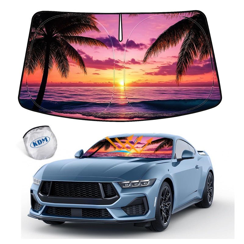 - 【100% Custom-Design】The Front windshield sunshade is compatible with Ford Mustang 2015-2024,100% Precise fit design makes a perfect and secure cover to the front window and Sunset Beach Design Pattern Makes Your Vehicle Special under Sunshine reflects personality and fasion