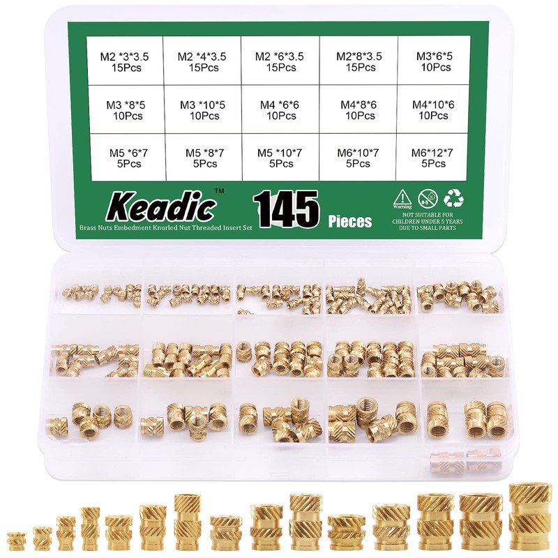 Keadic 145 Pieces M2 M3 M4 M5 M6 Thread Brass Knurled Nuts Assortment Set Internal Thread Insert Embedded Nuts Thread Knurled Heating Set for 3D Printer and Other Projects