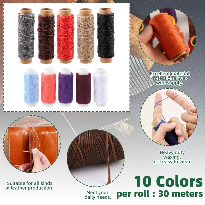 - Sturdy sewing thread: 150D waxed leather thread made of 6-ply high quality polyester yarn textile, moderate wax amount, not easy to deform and durable, which makes tightening the stitches very easy. Never fade and waterproof- braided. The end can be sealed by melting. Each of wax leather thread is 33 yards/30m in length, 1mm /150D in diameter.