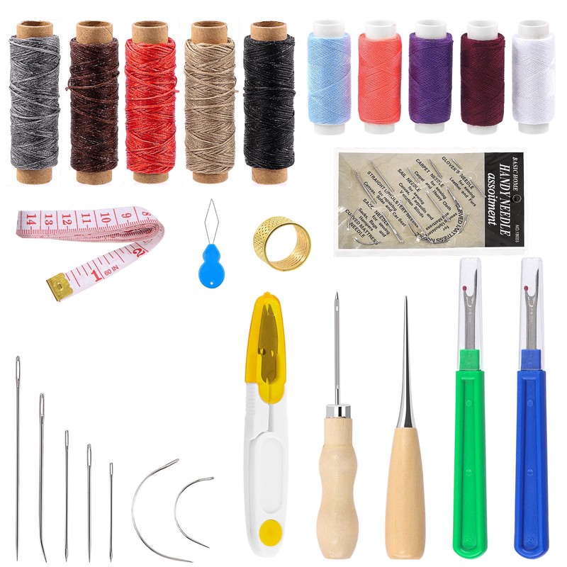 - What you get: you will receive 5 pieces leather waxed thread cord (in red, black, brown, dark grey and khaki), 10 pieces upholstery thread cord (in blue/red/purple/brown/white), 5 pieces big eye sewing needles, 2 x curved sewing needles, 1 x plastic threader, 1 x awl, 1 x leather piercing tools, 1 x U-scissors, 2 x seam rippers with covers, 1 x sewing thimble and 1 x pc measuring tape, totally 3 0 piece of leather sewing tools. The complete set will meet all your leather crafting needs!